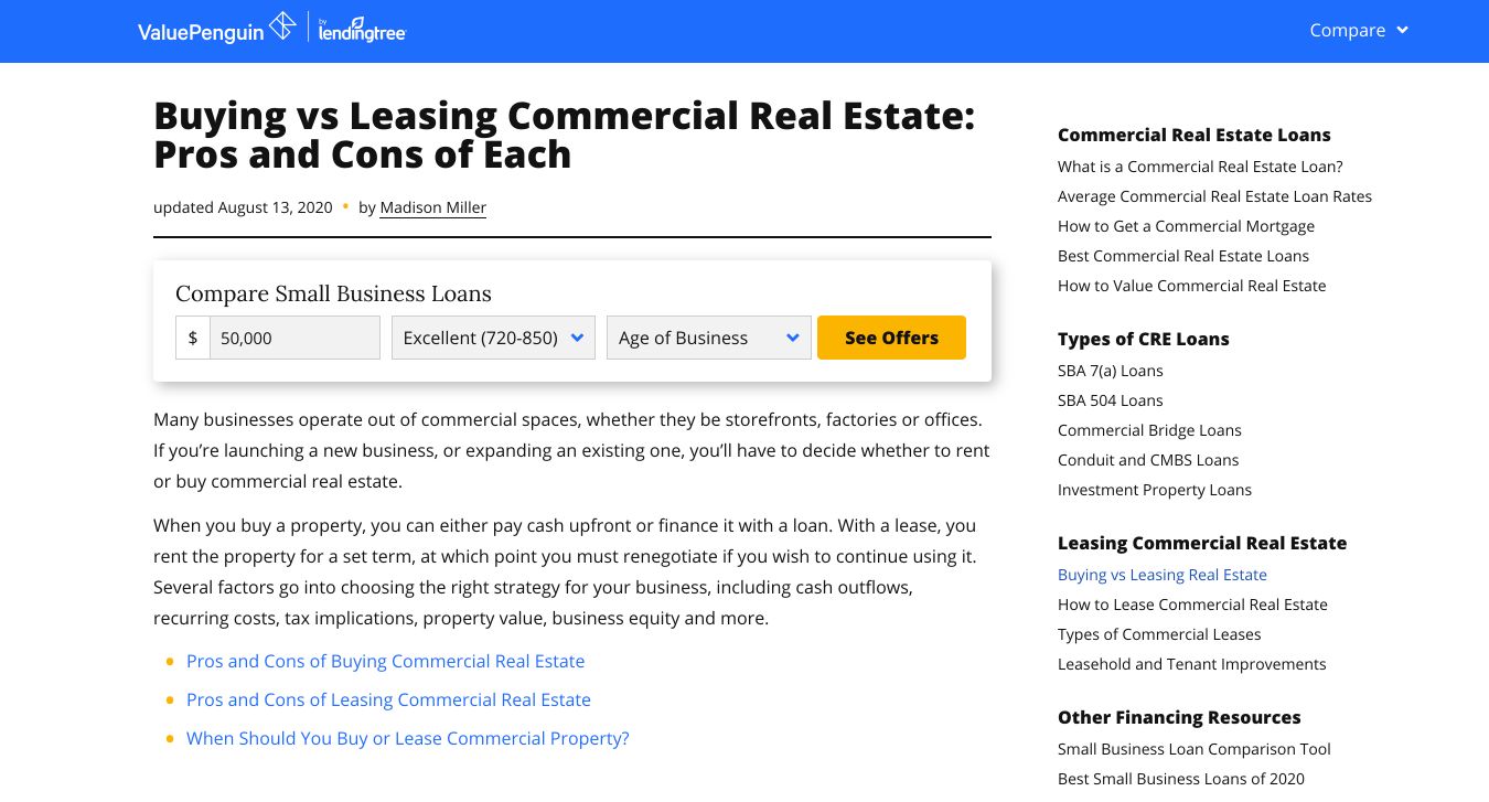在这里,与抵押贷款巨头Lending Tree联系在一起的Value Penguin提供了相关信息租赁和拥有商业房地产的详细比较: