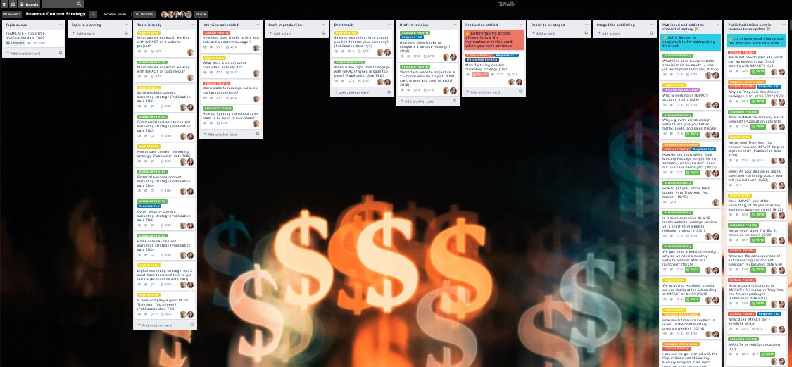 我们使用Trello来保持组织,上面有我正在写的每一篇文章的卡片和表示过程中每一步的专栏,从“收到的主题”到“发布和共享”