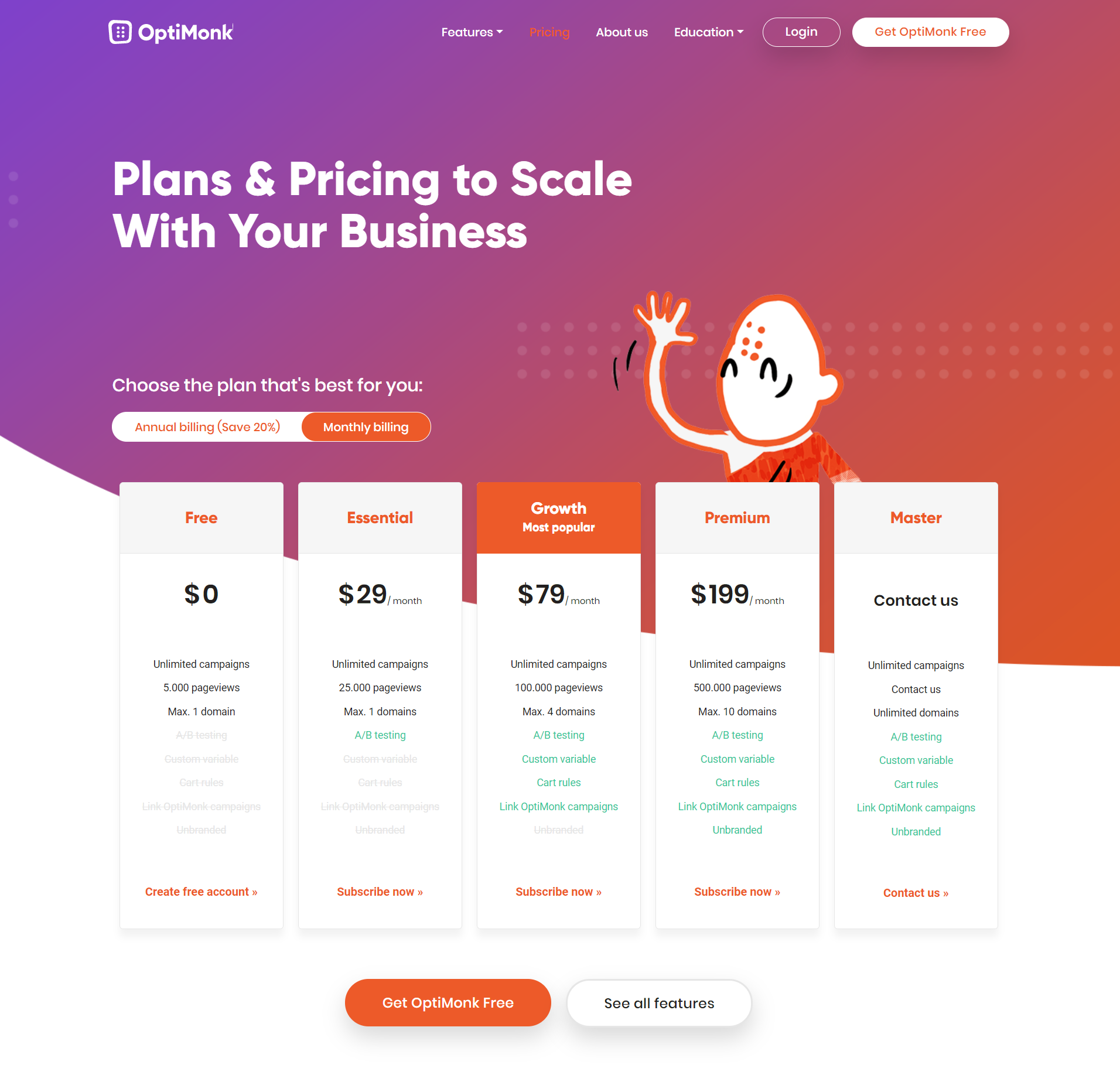 这里有一个很好的例子OptiMonk它允许用户查看不同的价格水平,以及它们各自包含的内容。它甚至为那些需要定制定价的用户提供了一个“联系我们”层级。
