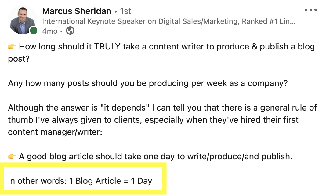 每周稳定地写三篇文章会使你相当忙碌。内容专家Marcus Sheridan,著有他们问,你回答说,每一件产品大约需要一天的时间来生产.换句话说,大约8个小时。