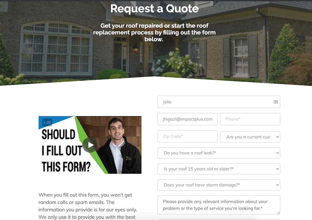 看看这个申请屋顶报价示例来自我们的客户比尔·拉根屋顶公司。视频本身只有46秒,上个月它的平均转换率是35%,比视频添加前一个月增加了105%。