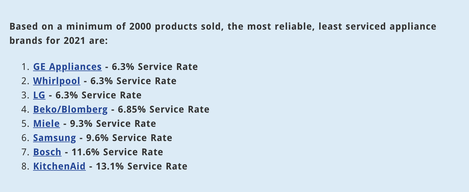 耶鲁电器公司每年销售成千上万的厨房电器,他们还提供上门服务。他们开始跟踪这些服务电话,看看哪些品牌最需要维修。